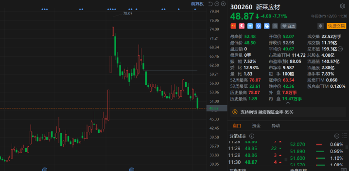新莱应材(300260.SZ)午间收跌7.7%,股价跌破50元关口,创近2个月新低,总市值下破200亿元大关。消息上,新莱应材发布股份减持公告,股东厉善君,张雨,李鸿庆,翁鹏斌,黄世华拟减持公司股份不超过31.95万股,减持比例不超过公司总股本的0.08%。业绩方面,半导体业务保持较快增长25Q1-3公司收入22.55亿元,同比+4.31%,其中Q3为8.45亿元,同比+13.72%,单季度营收创新高,尤其是半导体成为核心增长动力。